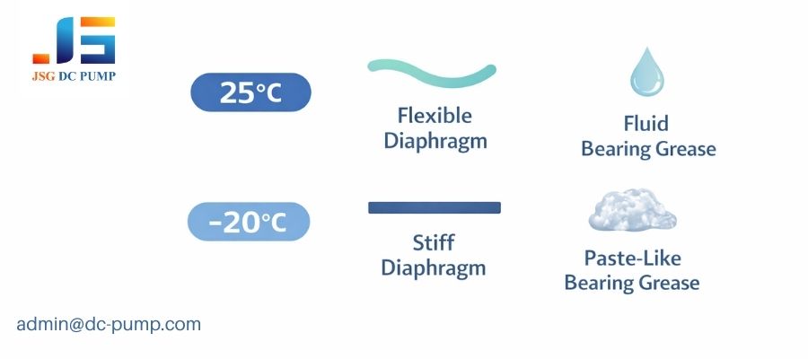• Diaphragm and Seal Hardening: The elastomers used for diaphragms and seals lose their flexibility. At room temperature, they bend easily. At –20°C, an EPDM diaphragm can become over 10 times stiffer. The motor must now literally force this stiff rubber to bend, adding a huge load before any vacuum is even generated.
