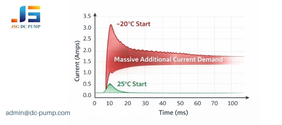 This is where the mechanical problem becomes an electrical one. The physics are straightforward. In a DC motor, torque is directly proportional to current. To generate the enormous torque needed to break the cold stiction, the motor will try to draw a proportionally enormous amount of current from the power supply. A pump that draws 500mA during a normal start might demand 2.5A or more at –20°C. If your PCB is designed to limit current to 1A, the startup will fail every single time. It’s a critical system-level mismatch. The power circuit isn’t designed to handle the demands the cold mechanics are placing on the motor. I’ve often had to advise clients to redesign their power stages specifically to allow for this brief but massive current peak.