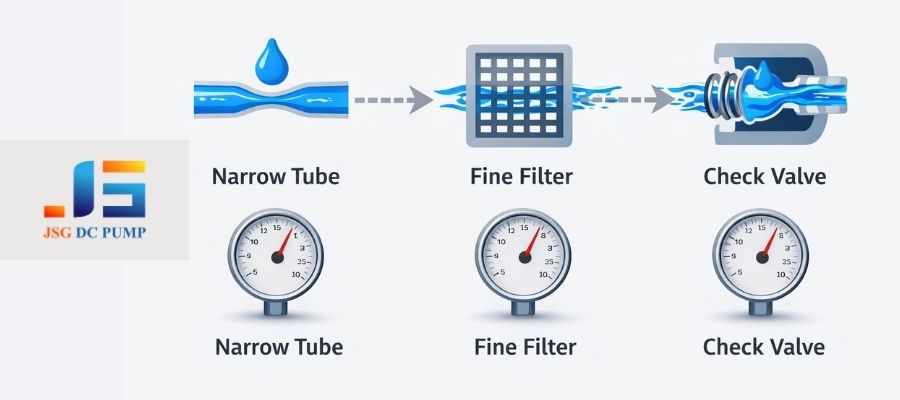 Tubing, filters, and valves create significant flow resistance (pressure drop). Even a small-diameter tube or a partially clogged filter can create enough back-pressure to drastically reduce your pump’s effective flow rate.
