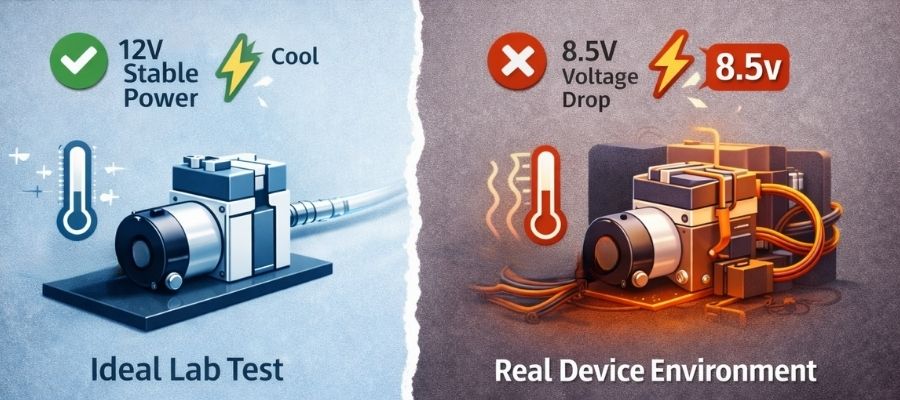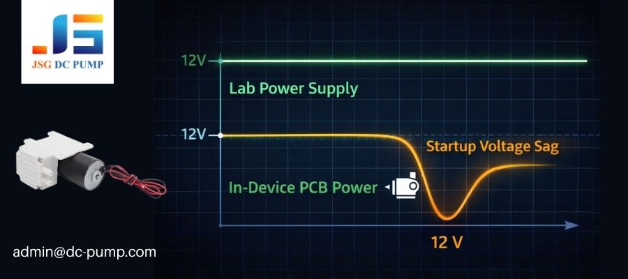 The pump runs perfectly on your 12V lab supply. But inside the device, powered by the main PCB, it stalls on startup or runs erratically. It’s the same 12V, so what’s the issue?