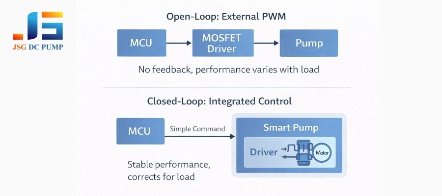 Pumps with integrated drivers offer closed-loop control that actively corrects for load changes, providing superior stability. External PWM is open-loop—it just sends a signal and hopes for the best, making it less reliable under variable conditions.