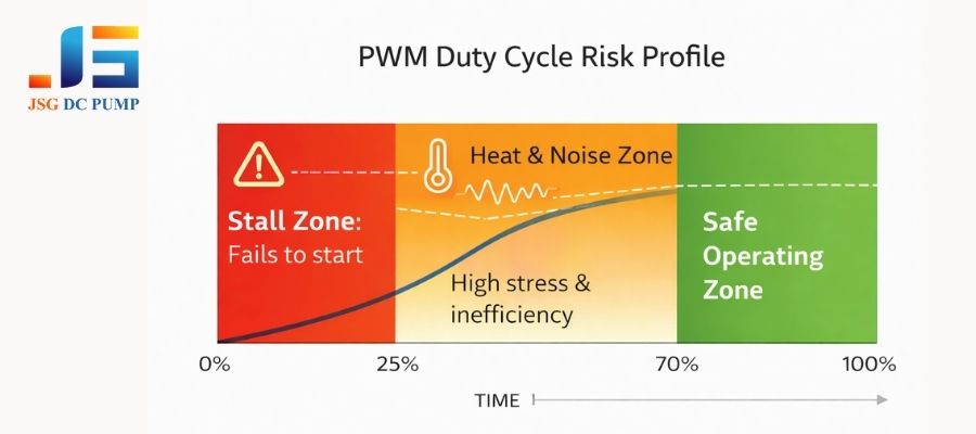 | Minimum Duty Cycle Definition | Through testing, find the lowest duty cycle at which the pump can reliably start under worst-case load. Your control software must never allow the duty cycle to drop below this threshold (often 25-40%). Use a higher “kick-start” duty cycle if necessary. |