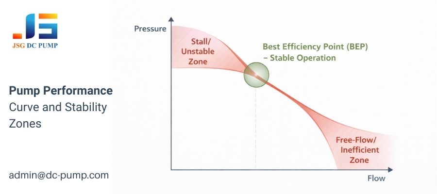 Every pump has a P-Q (Pressure-Flow) curve where it runs most efficiently and stably. Operating the pump at the extreme ends of this curve, such as near zero flow (stall) or zero pressure (free flow), causes turbulence and inefficiency, leading to instability.