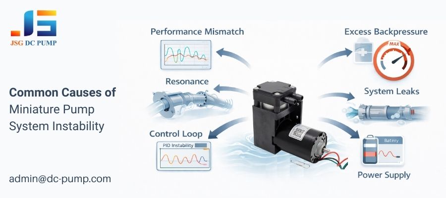 Mini pump systems become unstable when they operate outside their designed performance curve, encounter mechanical resonance, suffer from a poorly tuned control loop, have an inadequate power supply, experience system leaks, or face excessive backpressure causing stall.